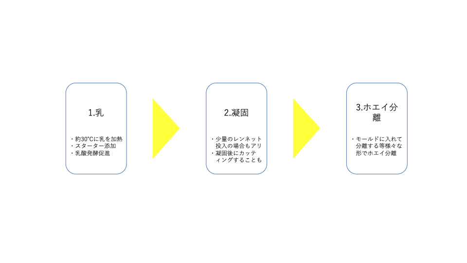 フレッシュチーズの凝固にはレンネットを加える場合もありますが、基本的に酸による凝固である事が特徴。凝乳から染み出すホエイの量は少なくカードの水分は多めです。